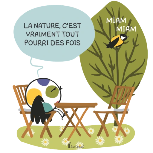 Elle est mignonne, cette planche, et elle me fait rire. Mais non, elle n'est pas dans la BD. Avec un peu de recul, je me suis rendue compte qu'elle n'avait pas tout à fait sa place dans l'ouvrage. Même si la nature et les oiseaux constituent un fil directeur dans ma manière de vous parler de mon quotidien et de mon autisme, cette planche n'était pas une des plus pertinente. Malgré tout… je l'aime bien quand même.